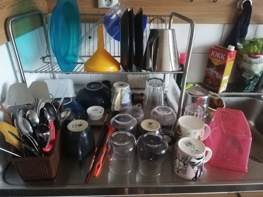 Istället för att stoppa tillbaka disken i skåpet kan en lägga den blöta disken på bänken och låta den torra stå i diskstället.